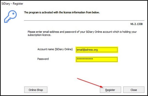 Enter your username and password (case-sensitive!) from SiDiary-Online and click on 'Register':