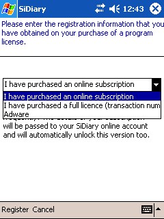 Should you have purchased the subscription version of SiDiary, it is possible to register all programme versions (PC, Pocket PC, Windows Smartphone, Android and Java-based cell phone) to use SiDiary for 12 months without encountering any adware restrictions or commercial pop-ups.