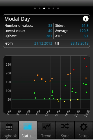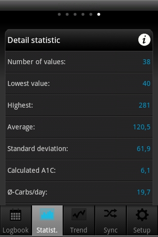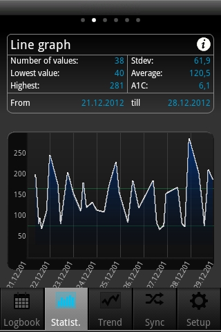 deviation, calculated A1C and so on. With a movement of your finger to the left you see the other graphs; with a tap on the i-symbol you will enter