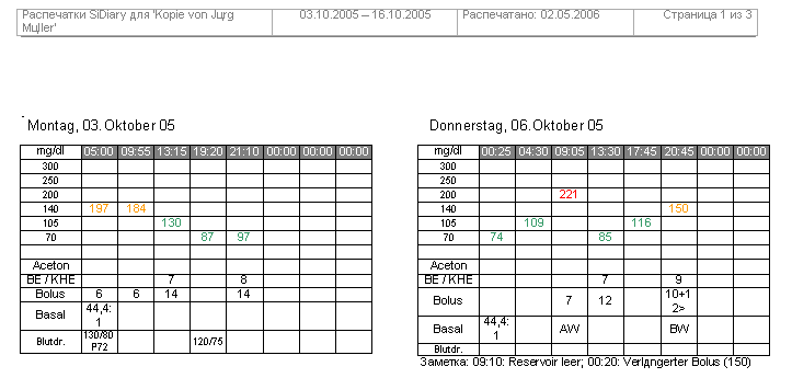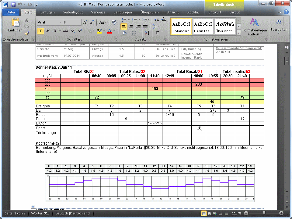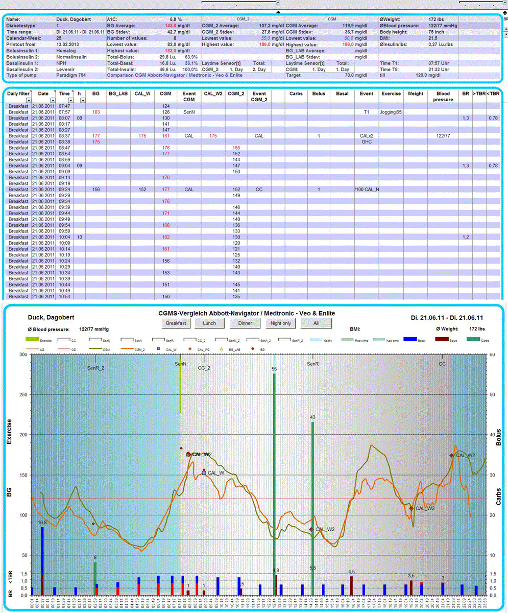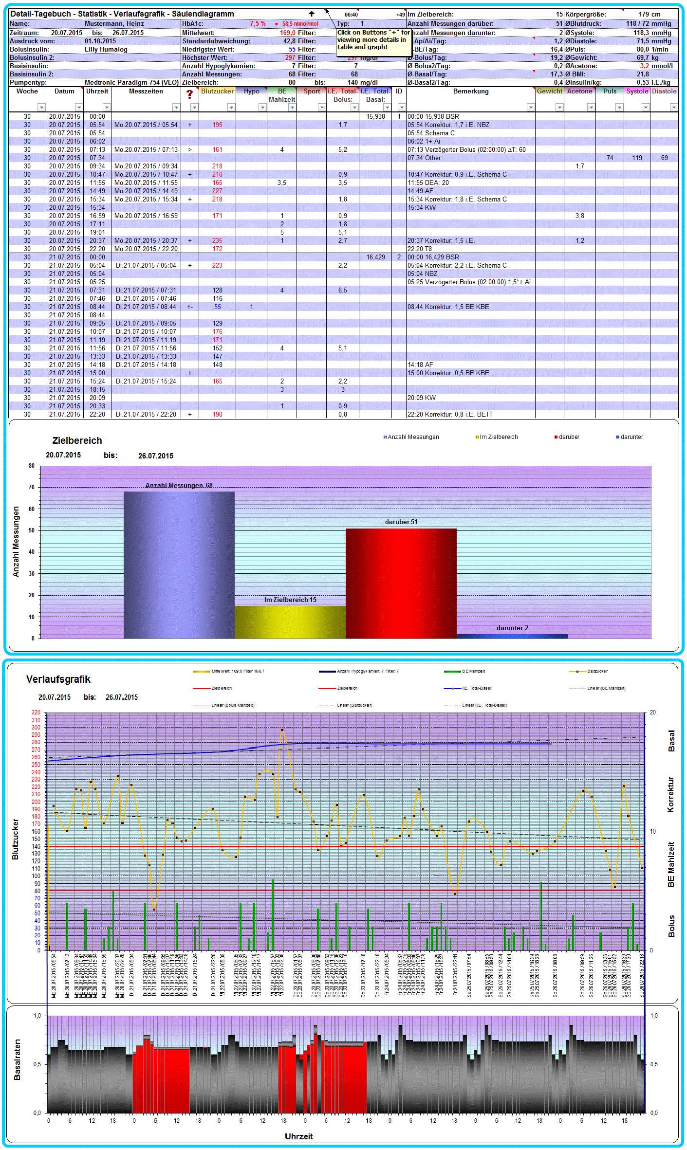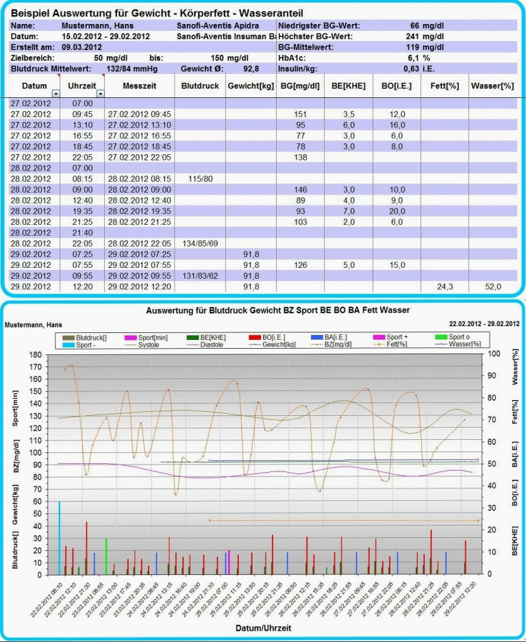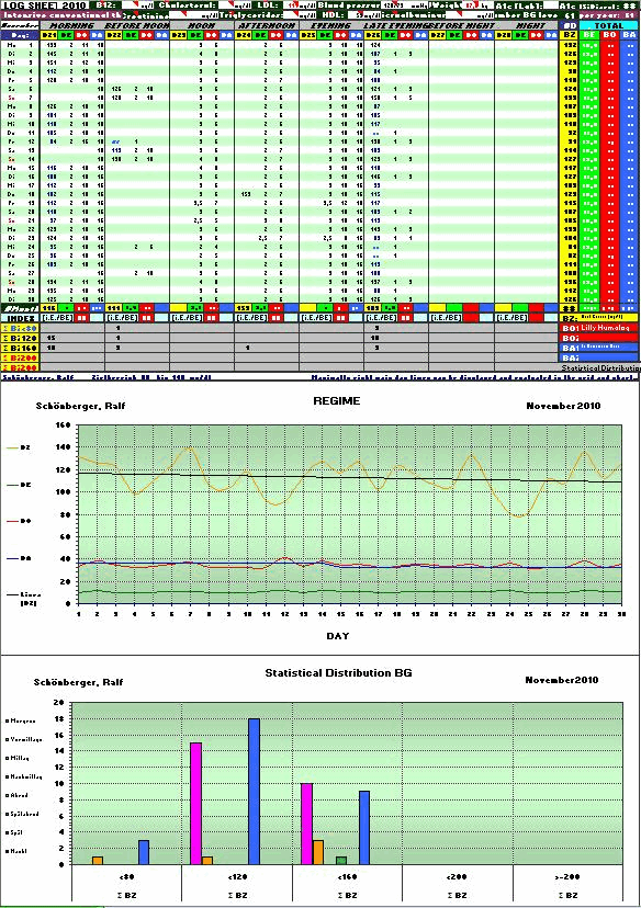 (Multi-Language-support!) Sehr schöne multilinguale grafische Auswertungen in Excel. Blutzucker in mg/dl oder mmol/l wird in Zusammenhang mit BE´s oder KH´s und bis zu 4 Insulinsorten gesetzt. BSR, Gewicht, Aceton und Blutdruckkurven können ebenfalls ausgegeben werden. Bietet diverse Analyse-/Filter-Möglichkeiten. Very nice multilingual graphical reports in Excel. Blood glucose in mg/dl or mmol/l will be set in the context of BE´s or Carbs and up to 4 types of insulin. BSR, weight, acetone and blood pressure curves can also be displayed. Offers various options for analysis and filtering. |