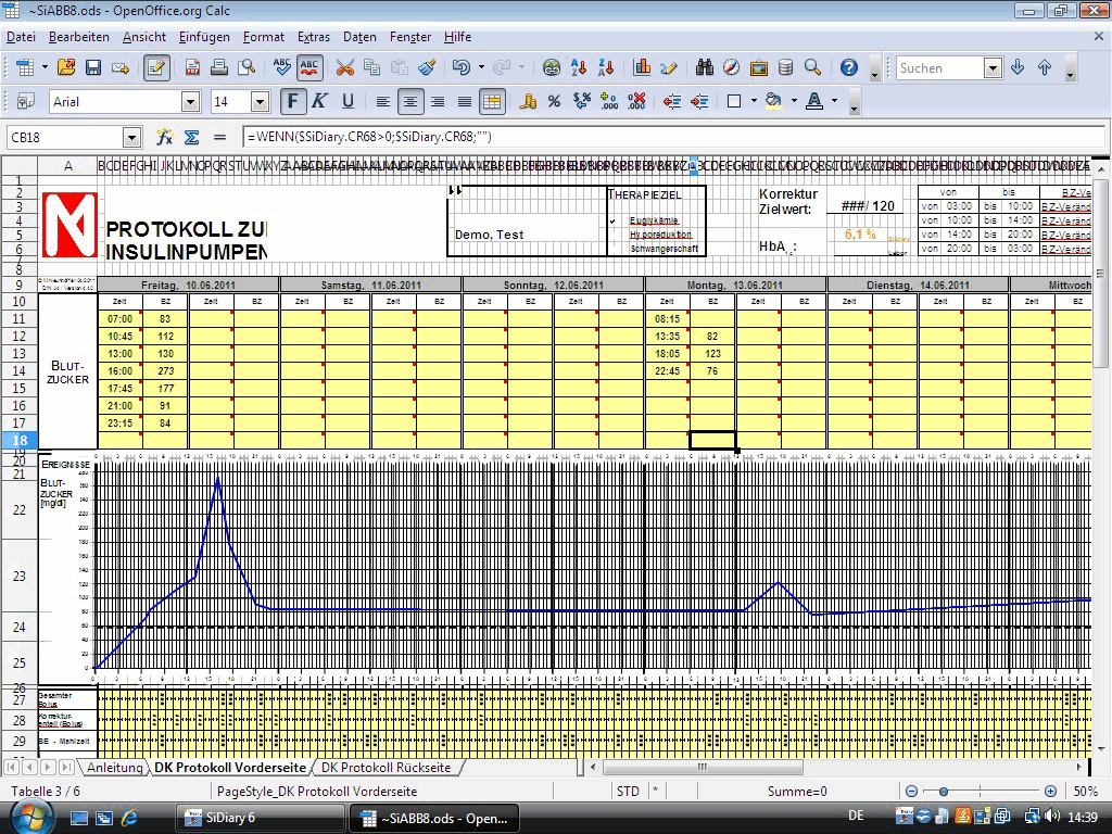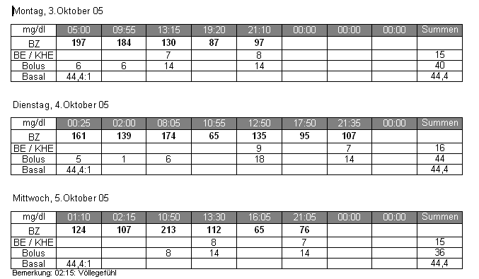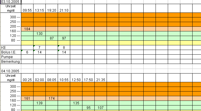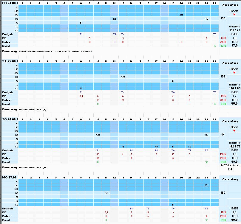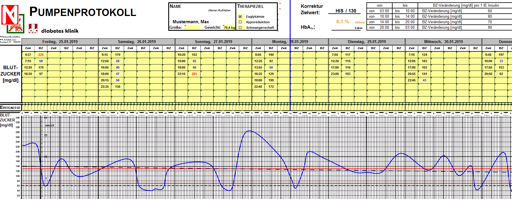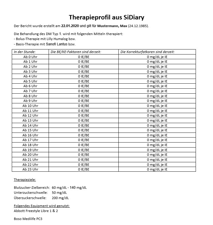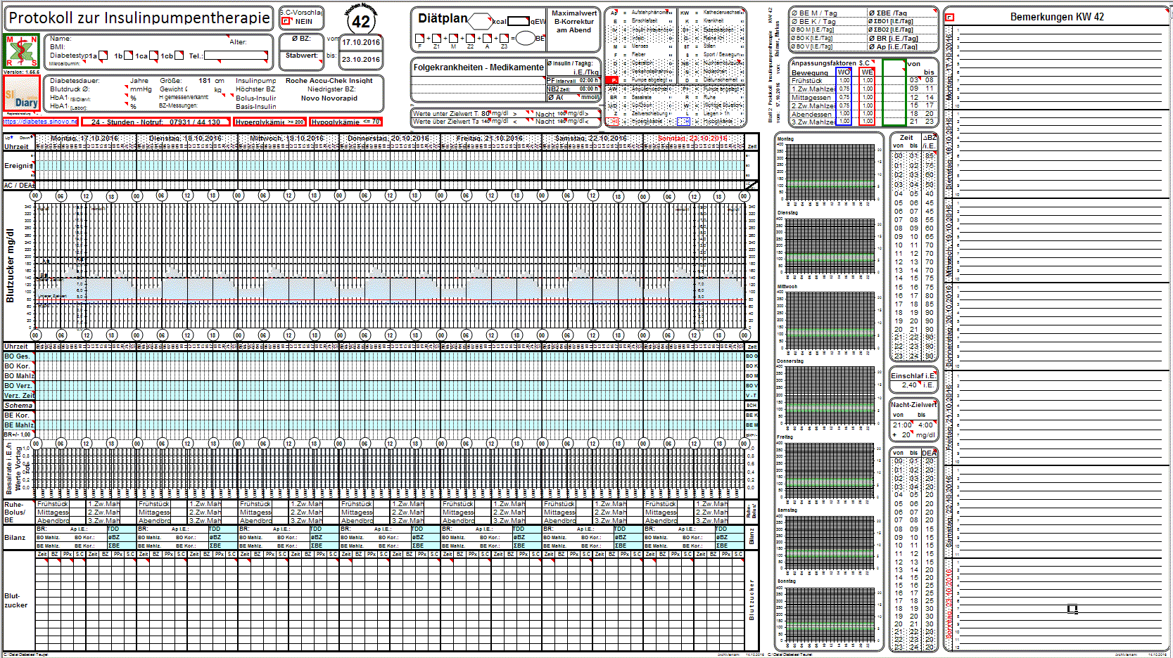 Vorlage zur Abbildung des in Althausen eingesetzten Insulinpumpenprotokolls nach Dr. Teupe. Die SiDiary-Vorlage entstand auf der Excel-Vorlage von Michael Neunhoeffer in Gemeinschaftsarbeit einiger SiDiary-Forums-Mitglieder unter Federführung von Ralf Schönberger. Die Vorlage ist nicht für Patienten ohne entsprechend geschultes Know-How geeignet! Die Darstellung/Protokollierung setzt Wissen voraus, das dort im Rahmen der Pumpenschulungen vermittelt wird! Jetzt auch mit den Anpassungsfaktoren und geeignet für mmol/l User. |