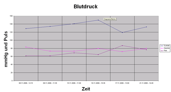 Exportiert die Blutdruckwerte in eine Excel-Übersichtstabelle und zeigt dort eine entsprechende Blutdruckkurve an. |