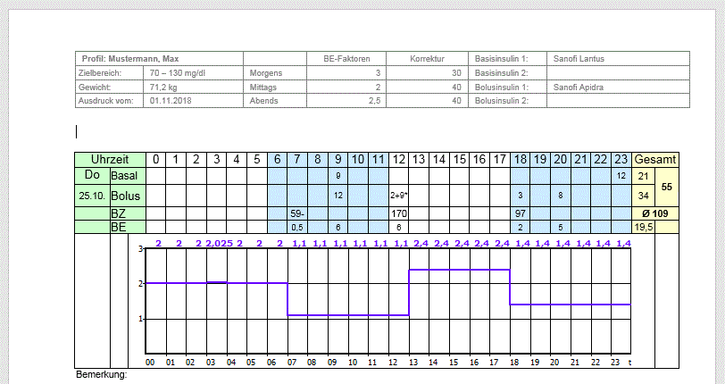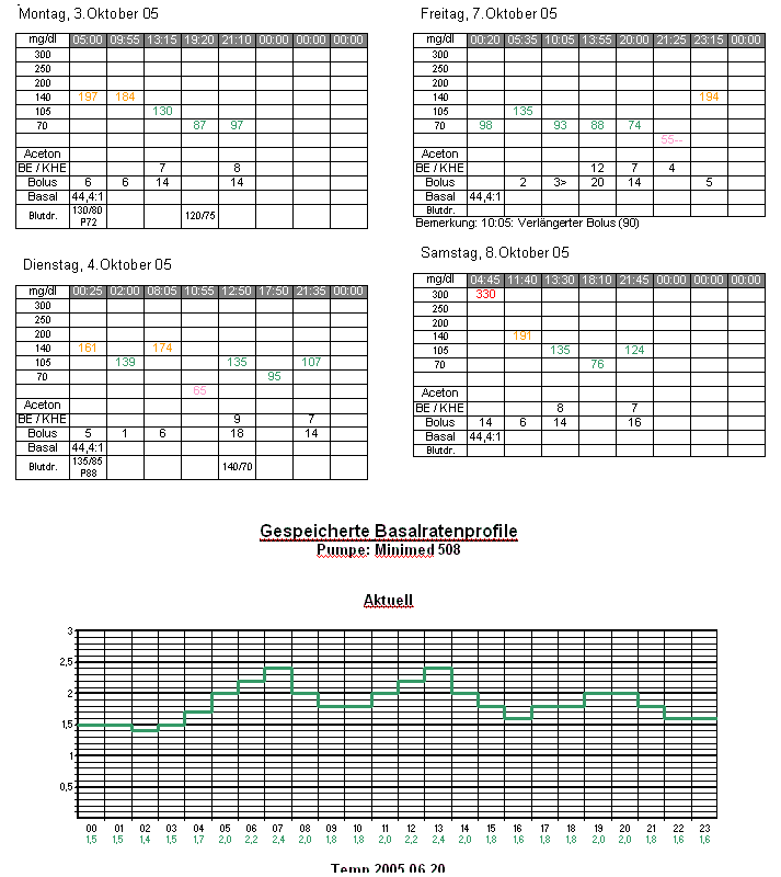 (Multi-Language-support!) Druckt die Werte wie in der Standardvorlage und am Ende der Blutzuckerübersicht die jeweils gespeicherten Basalprofile. Prints your data like the default template. At the end of the report a list is created with all basal basal profiles from your pump. |