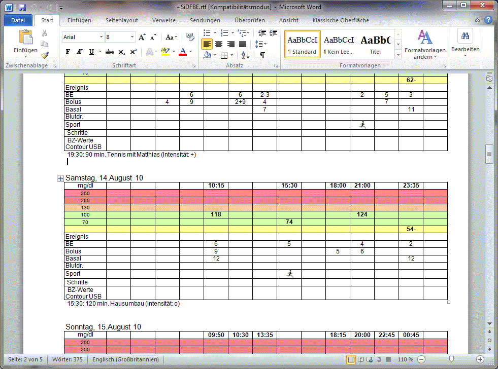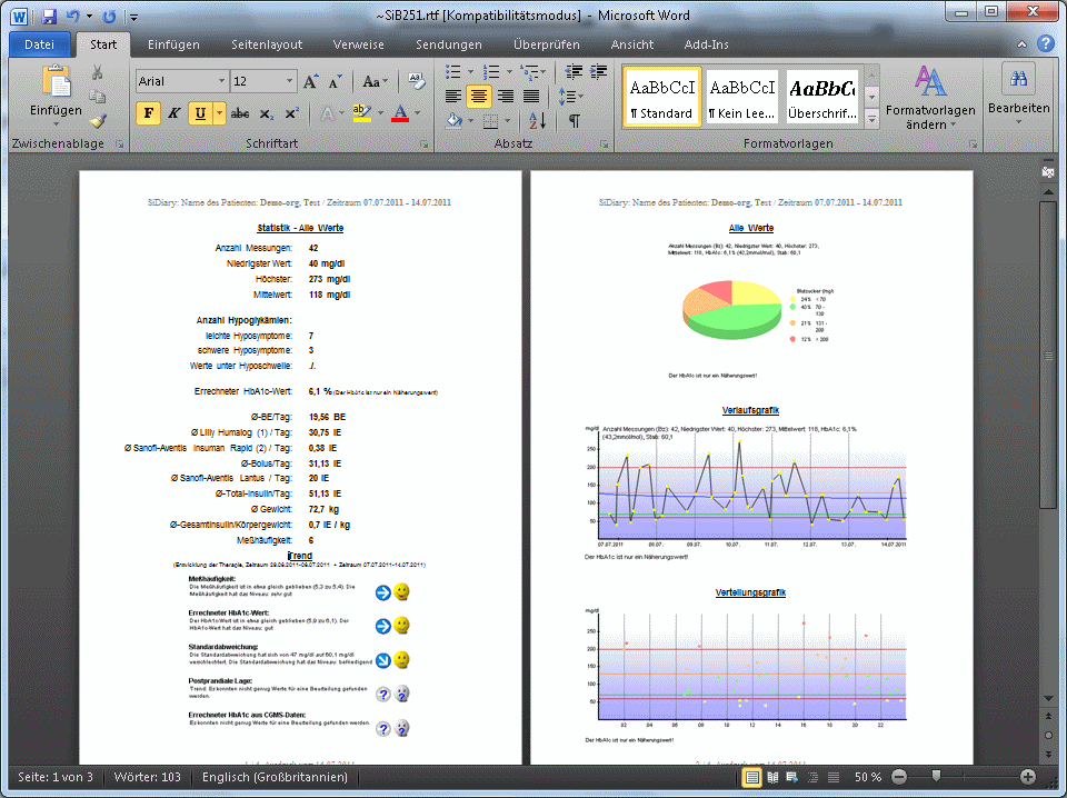 (Multi-Language-support!) Monatsübersicht für alle Werte mit Laborbericht. Ausdruck passt auf eine DinA4-Seite. Monthly overview of all values grouped by main day times. Includes a regime graph. Can be printed to a letter page. |