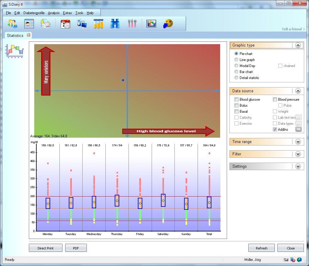 Si vous souhaitez consulter votre taux de glycémie d'un seul coup d'oeil, vous pouvez télécharger cet AddIn gratuit pour compléter votre outil statistique. Vous pourrez ainsi visualiser votre taux de glucose sanguin moyen et l'écart type durant la période choisie. Nous avons aussi développé une semaine standard, qui va vous permettre de projeter vos relevés glycémiques d'une période donnée seront projetées sur les sept jours de la semaine.Cliquez ici pour avoir un aperçu