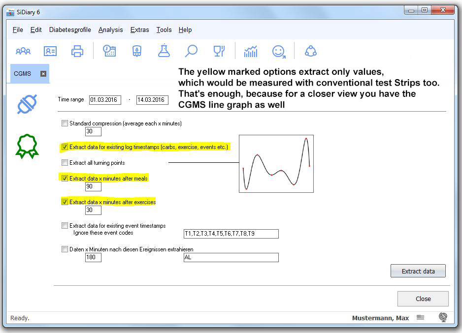 Les utilisateurs de CGMS (tels que Freestyle Navigator ou Dexcom Seven Plus) nous ont demandé si il était possible d'extraire des valeurs depuis leur type de données CGMS et de les rentrer automatiquement dans leur journal de bord. Avec cet AddIn c'est maintenant possible. Installez-le comme indiqué ci-dessus, activez-le dans le menu 'Extras ->AddIns' et démarrez-le dans le menu 'Edit ->CGMS'. Maintenant vous pouvez sélectioner la période pour laquelle les valeurs doivent être extraites ainsi que les critères d'extraction. Ensuite cliquez sur 'Extract data' et vous trouverez les valeurs en détail dans votre journal.Cliquez ici pour avoir un aperçu