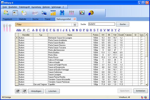 nutrition values or edit the standard entries of SiDiary with the buttons Add or Delete or by direct editing within the grid.