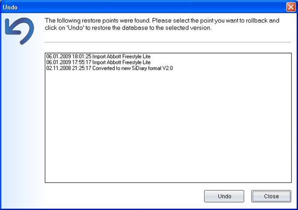 With the Undo function you can reset the database, which can be necessary in some situations. SiDiary works like Windows with restore points, so you can get back to such a step if required. The most recent restore point is displayed in the menu name.