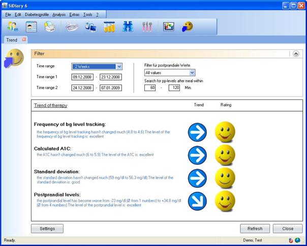 With the trend function of SiDiary you are able to analyze your tracked values and review them with common smiley-buttons. In this process the two time ranges will be compared to each other. So you can see very clear where you have improved so far and where more improvement is needed.