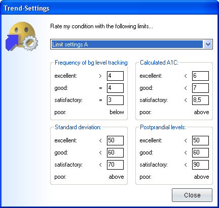 You can also define when a blood glucose value should stand for a pp-measuring (in minutes after the entry of the bolus insulin). The division into the categories excellent, good, satisfactory and poor based on therapeutic targets, which you have defined with your doctor or your diabetologist.