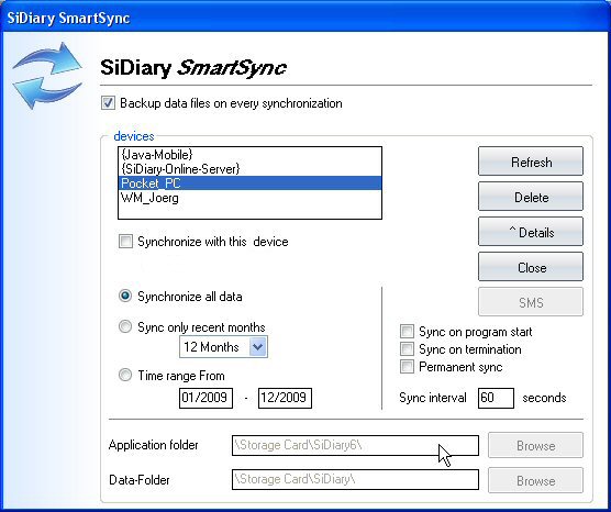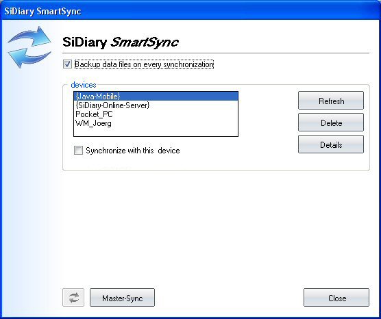 marked device (in this example ‘Java-Mobile’) all SiDiary-Data will be erased