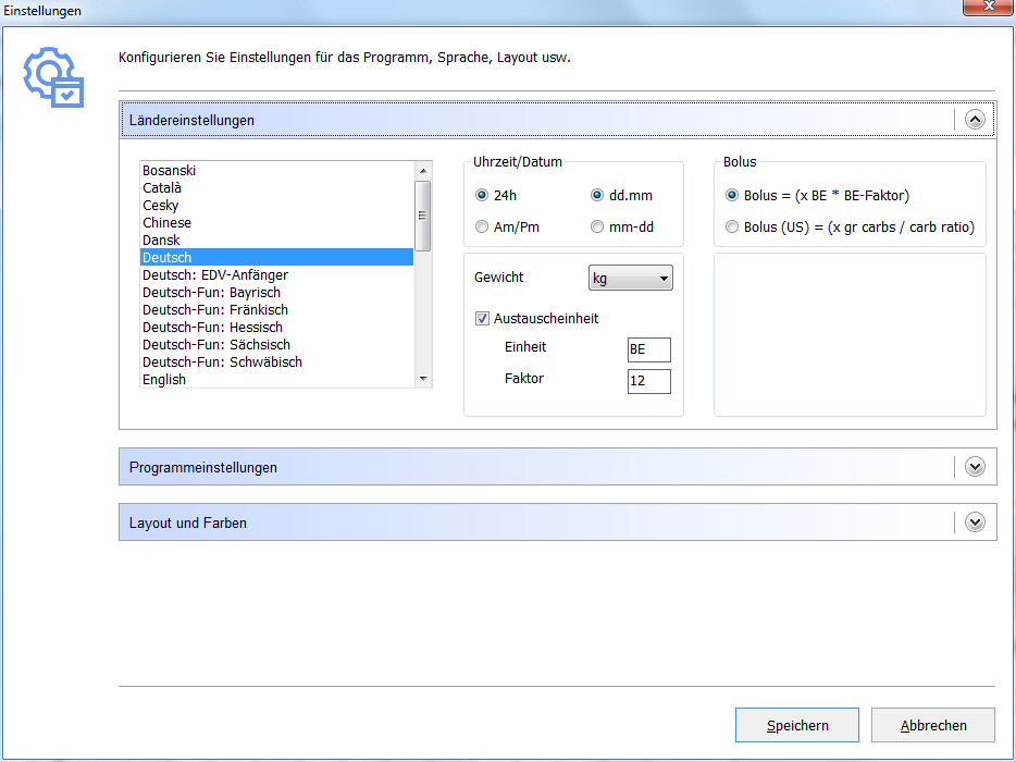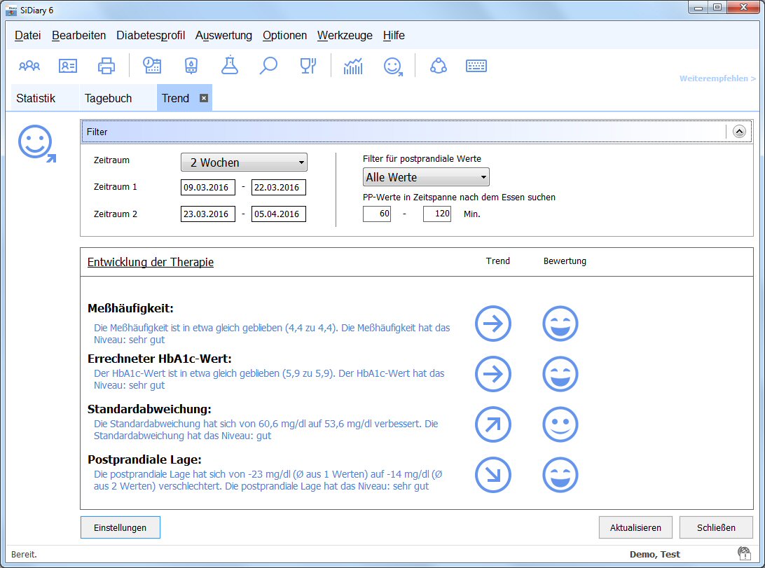 Wenn Sie die ersten Werte erfasst haben, können Sie diese mit der Analysefunktion bewerten und einen Trend anzeigen lassen. Wechseln Sie auf die entsprechende Karteikarte und klicken Sie ggf. auf Aktualisieren. Diese Funktion setzt natürlich eine gewisse Anzahl an Daten voraus und wird mit der Menge der eingegebenen Daten immer aussagekräftiger! Die Grenzwerte für die Beurteilung Ihrer Werte können Sie individuell an Ihre Anforderungen anpassen (Taste "Einstellungen"). Zusätzlich können Sie im Programm all Ihre Laborwerte erfassen und protokollieren (HbA1c-, Nierenwerte usw.). |