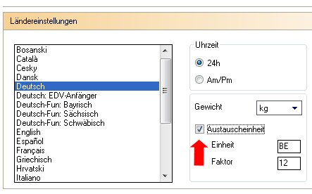 Falls sie z.B. mit 12 gr. Kohlenhydrate = 1 BE rechnen, so können sie dieses hier festlegen. Natürlich können Sie als Einheit auch 'KE' verwenden und mit 10 gr. KH rechnen.